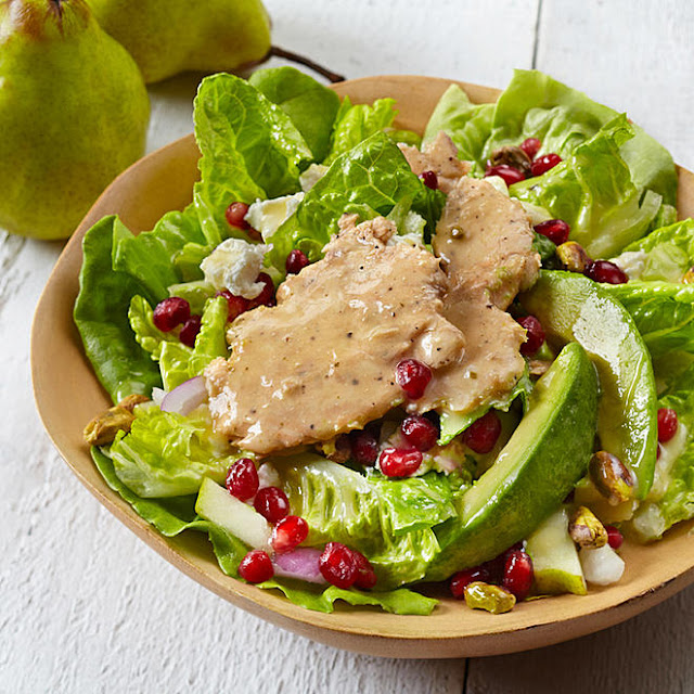 Лосось с лимонным перцем и цитрусовый винегрет добавляют вкусную цедру в эту смесь авокадо, груши, фисташек и козьего сыра.